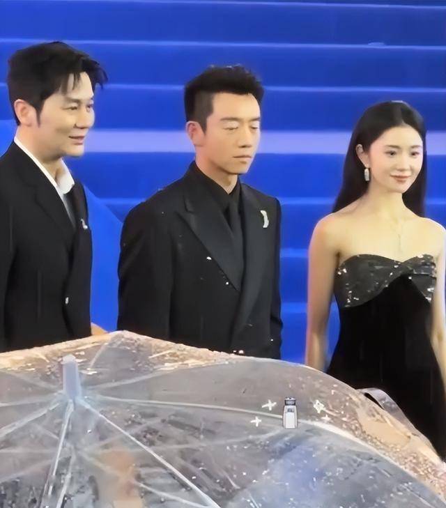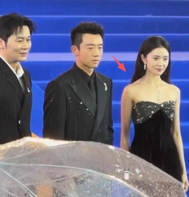 其他明星都卯足劲在红毯上露肩颈,下雨也要穿露肩礼服,她却选了完全不露肤的长袖西装,身材遮的严严实实。