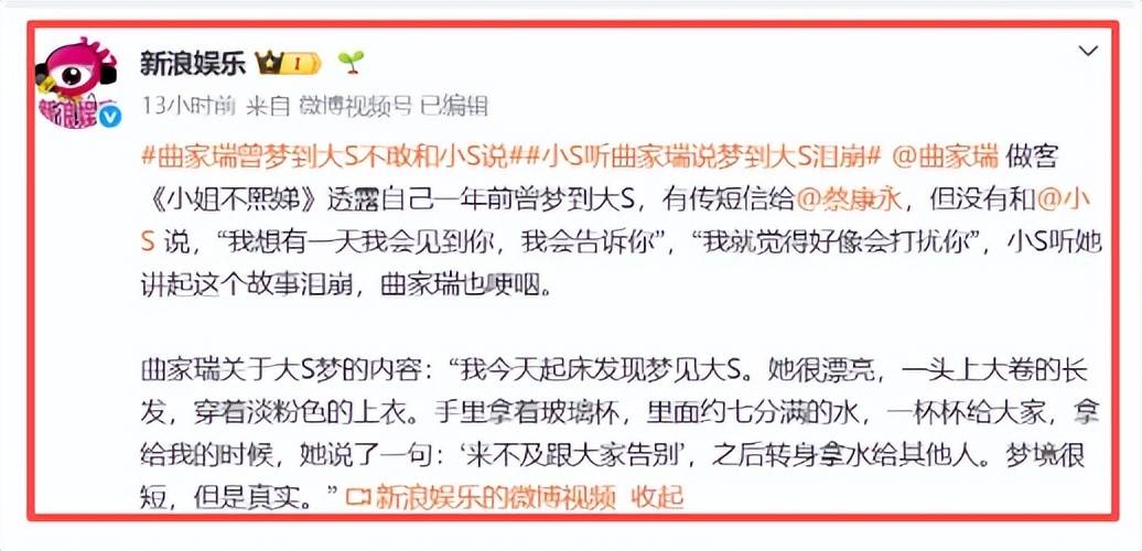 曲家瑞说,她梦见大S。梦里的大S穿淡粉色上衣,长卷发很蓬松,整个人亮得像刚从摄影棚走出来。