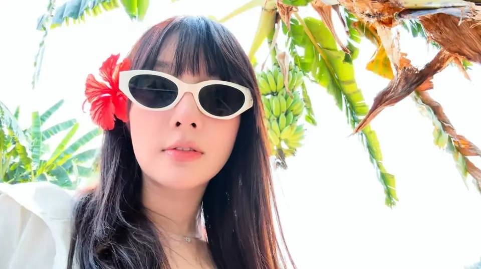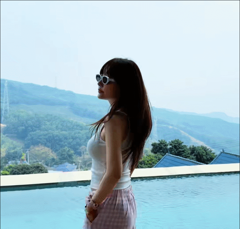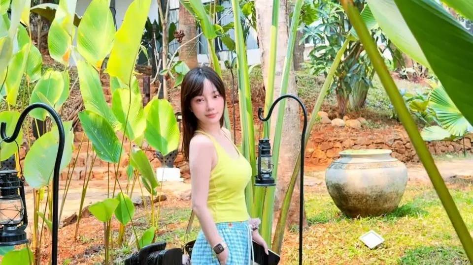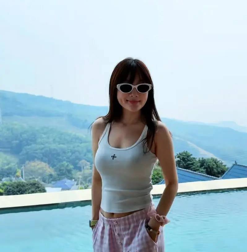 她当天的穿搭也很“会”。白色露脐背心,粉色格子长裤,整套不是红毯的精致,是旅游的轻快。加上长发披着、齐刘海一压,少女感就被推上来了。