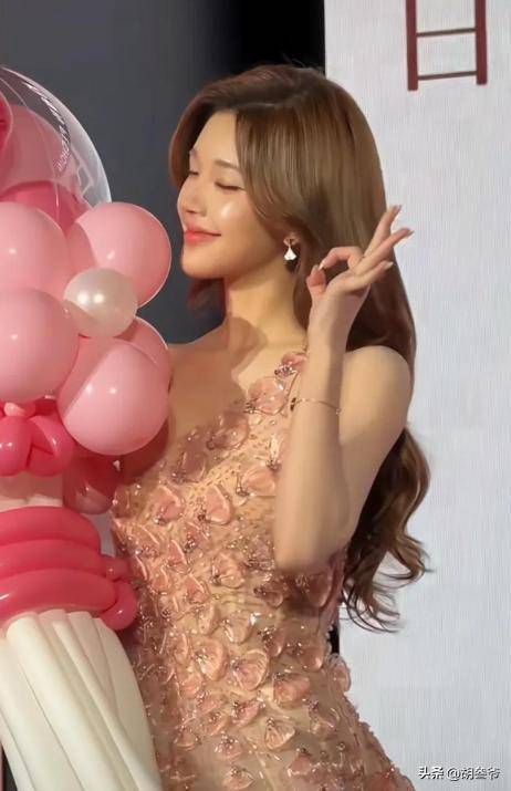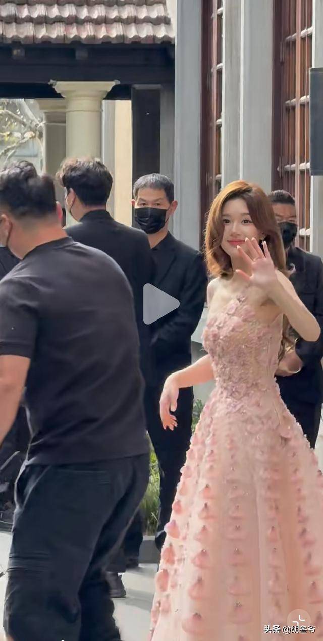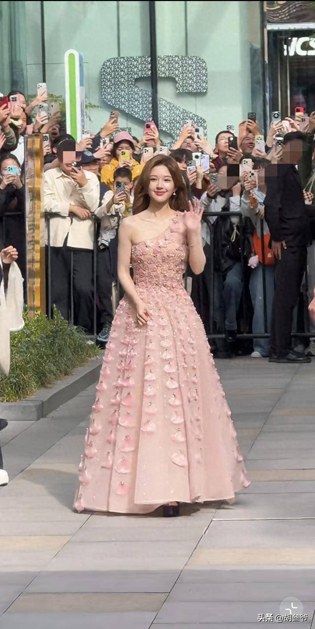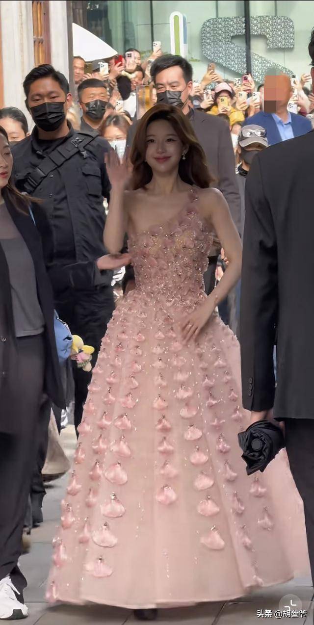 她穿的是PhanHuy2026春夏高定淡粉色单肩花瓣长裙,裙子上全是立体花瓣和细闪钻饰,阳光一照整个人都在发光,大裙摆走路轻盈灵动,氛围感直接拉满。