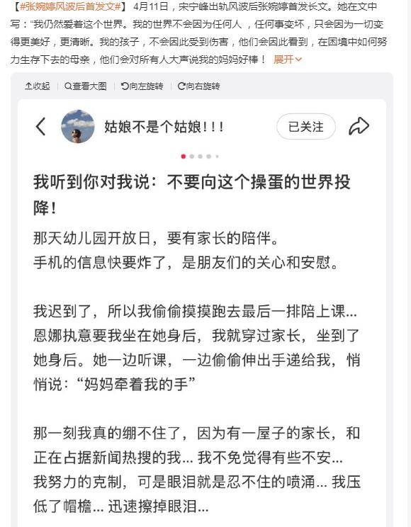 但故事还没有完,正在大众都猜测两人会不会因此离婚时,张婉婷于4月11日发送千字长文,内容大概以“为孩子做个值得骄傲的妈妈”为主题。