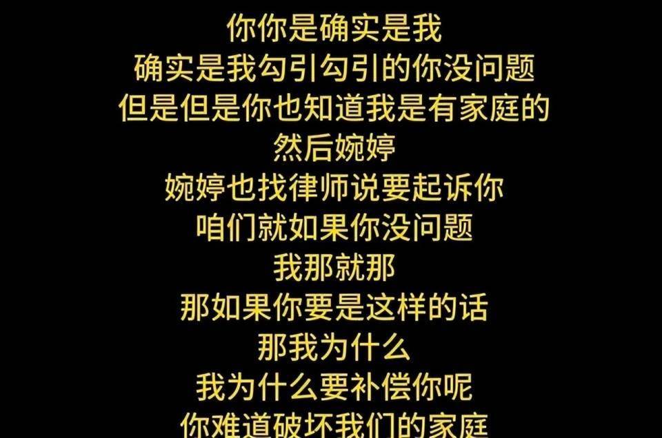 直至上个月被曝出出轨,录音中还涉及到“确实是我勾引你,但你破坏我家庭你不应该补偿我吗”“承诺算个p,我还说爱婉婷一辈子呢”等炸裂发言。