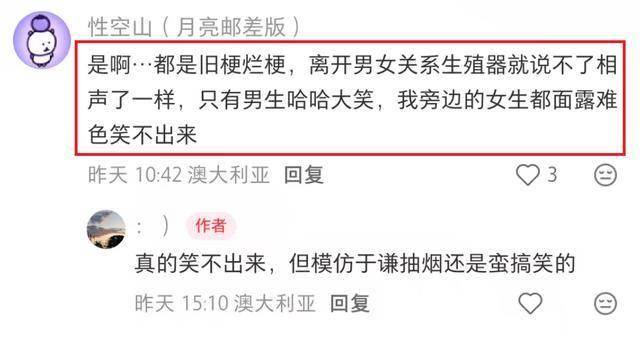 还有其他澳大利亚观众深有同感,有一位网友写道:都是旧梗烂梗,离开男女关系、生殖器就说不了相声一样,只有男生哈哈大笑,我旁边的女生都面露难色笑不出来。