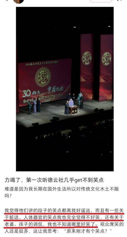 为什么这么多观众会吐槽无聊呢?有一位第一次去现场听德云社相声的澳大利亚观众发文写道:我觉得他们讲的段子笑点都离我好遥远,而且有一些关于脏话、人体器官的笑点我也完全觉得不好笑,还有关于老婆、孩子的调侃,我也不知道哪里好笑了。