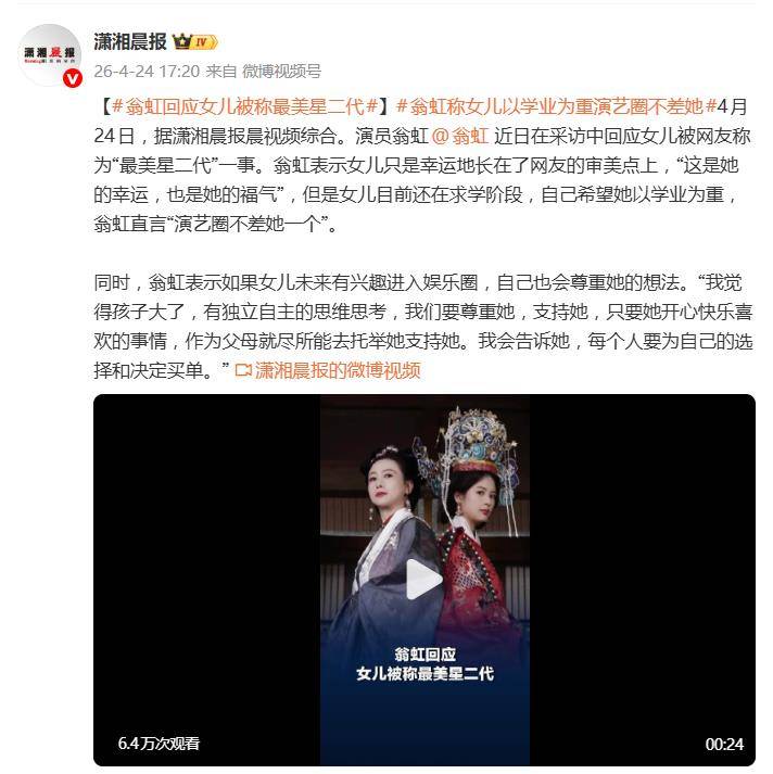 面对女儿被网友封为“最美星二代”,翁虹并没有顺势接住这波流量,反而表现得相当低调。她谦逊地表示,女儿只是“幸运地长在了网友的审美点上”,并直言“这是她的幸运,也是她的福气”。这话听起来轻描淡写,但背后藏着一位母亲对女儿清醒的认知:颜值是加分项,但不是人生的全部。