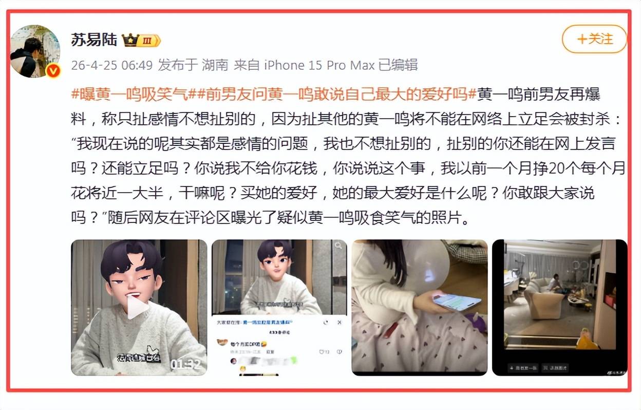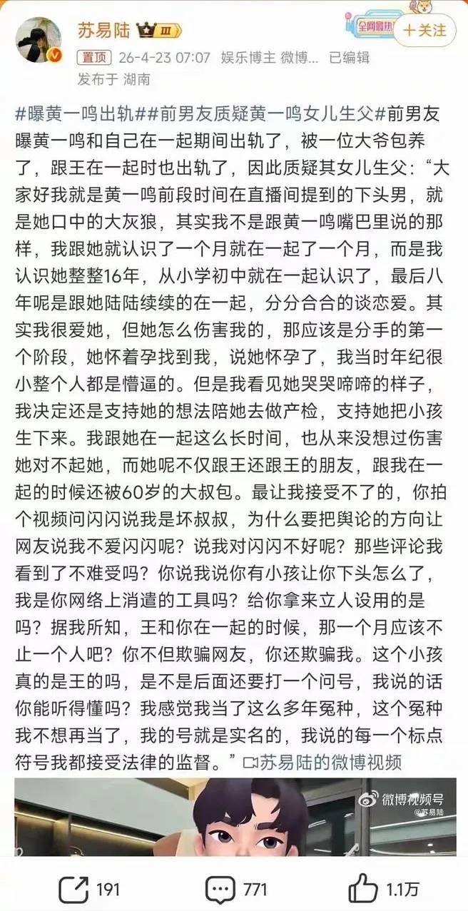 苏易陆还抛出一个点:黄一鸣的现任男友,疑似是闺蜜的前男友,两人分手后“火速”在一起。