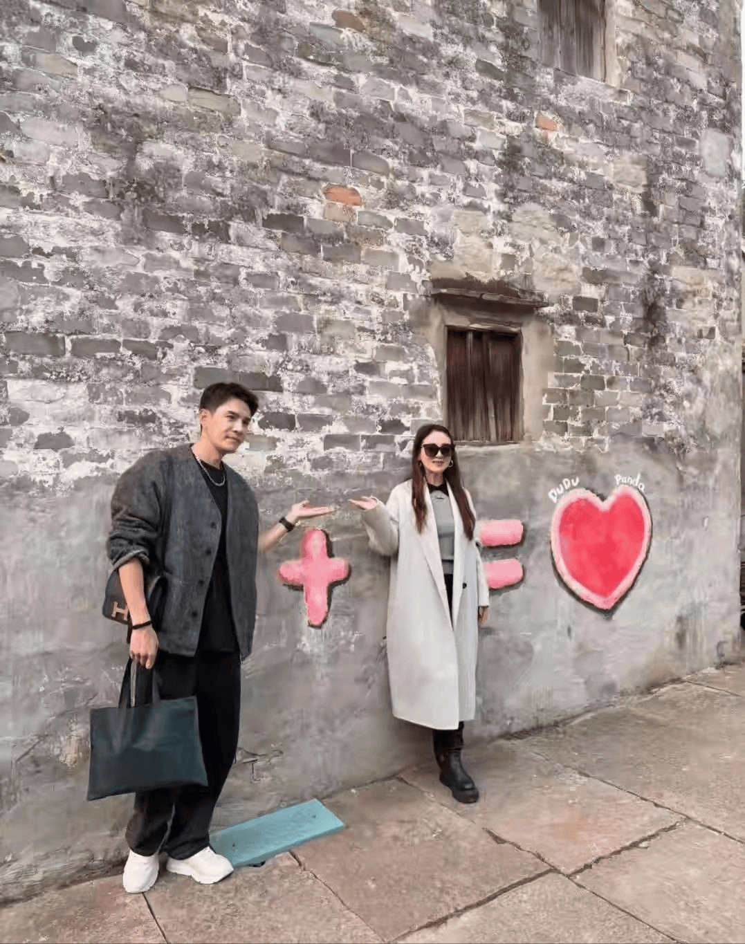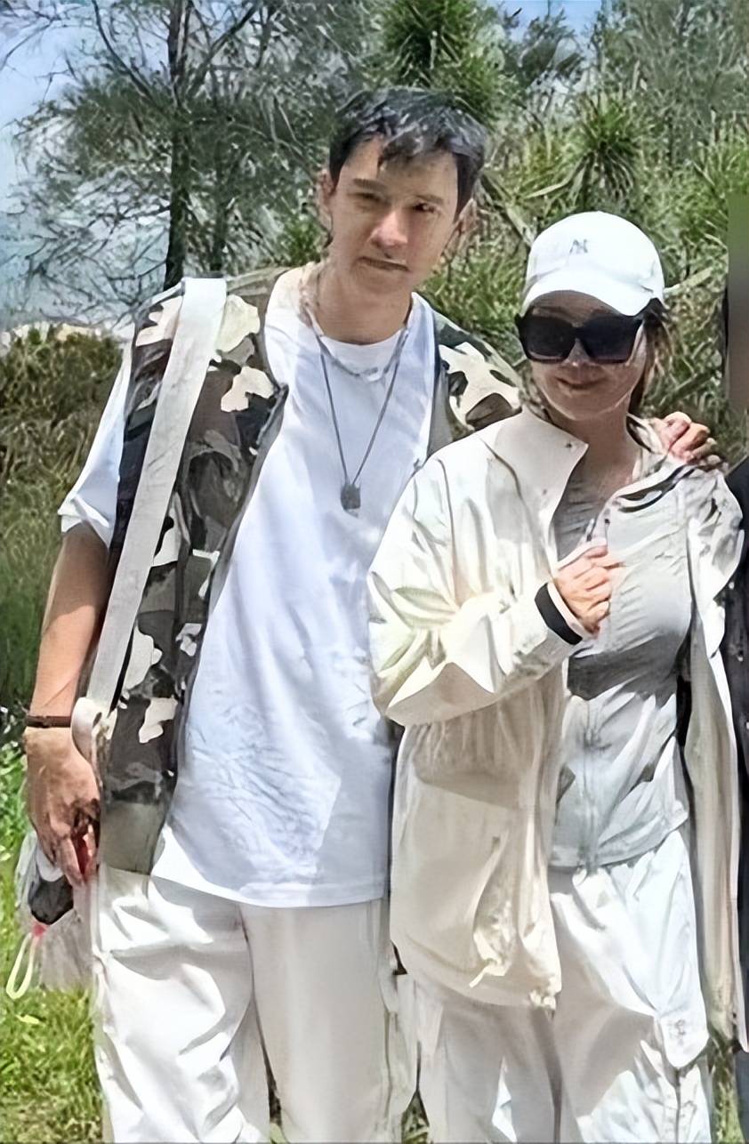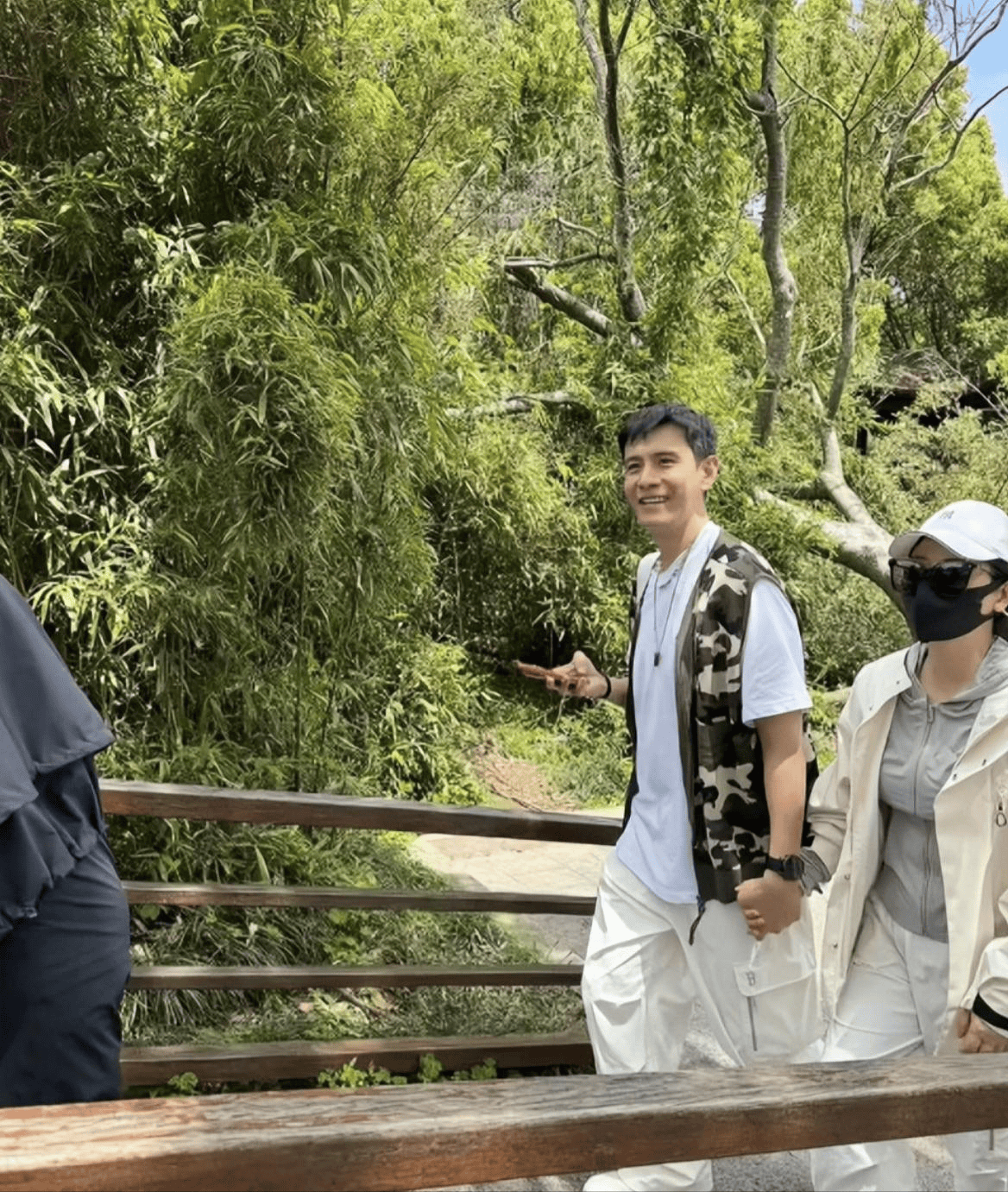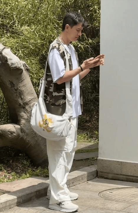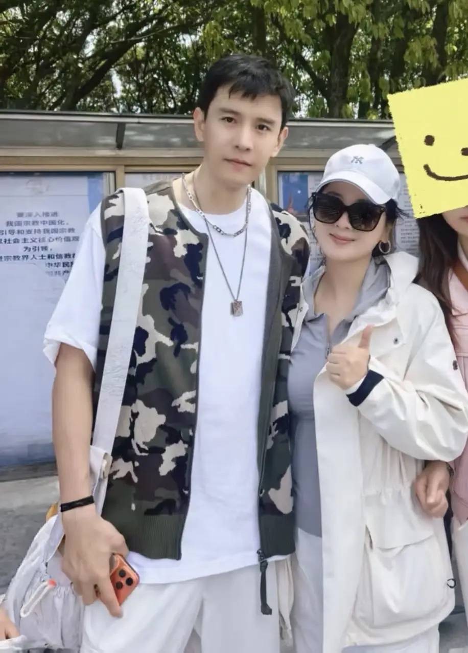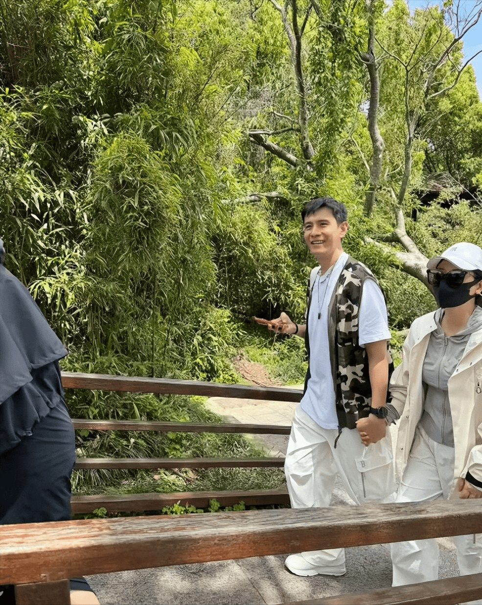 经超就更像普通人:白T、运动裤、外搭一件迷彩坎肩,包自己背着,站在她侧后方,不抢香、不抢镜,像那种出门永远负责“看路、看人、看台阶”的人。