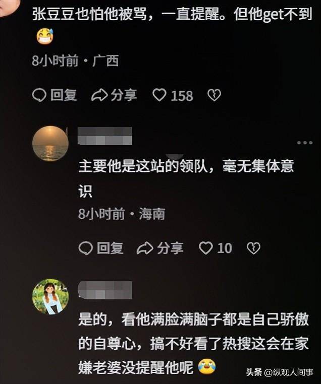 有网友吐槽,以他的骄傲和自尊心,就算看到热搜,大概率也会在家嫌张豆豆没提醒他、没照顾好他的面子。
