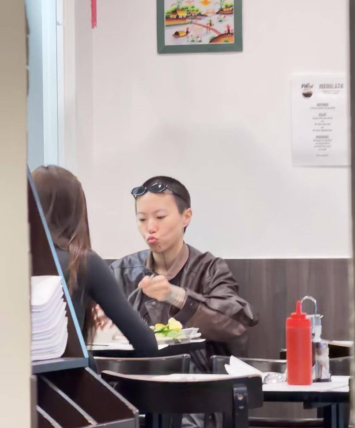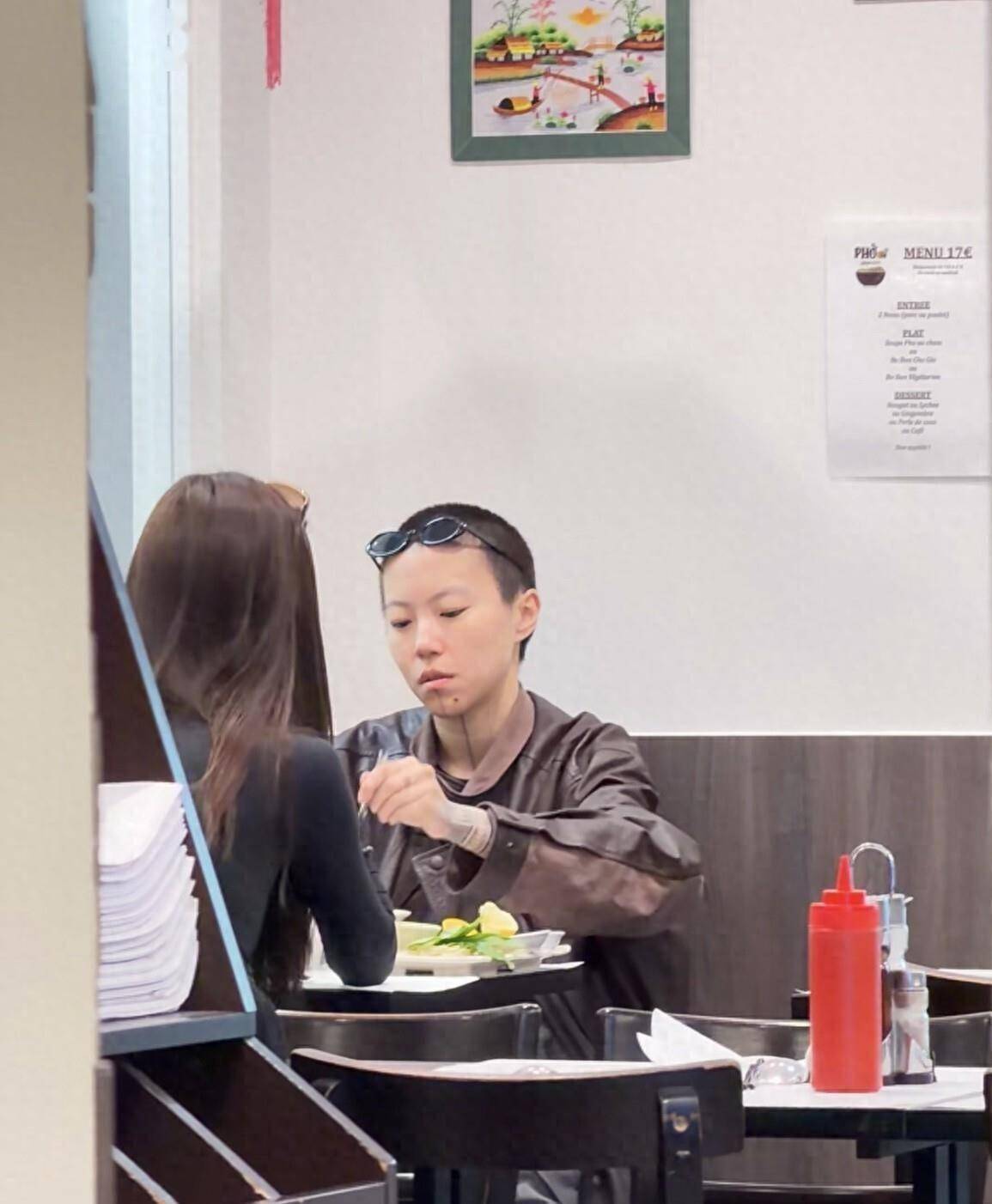 网友抬头看见邻桌两个女生,一开始没敢认。 仔细看才发现,寸头墨镜配皮衣的是窦靖童,下巴和手腕的纹身清晰可见。 对面长发披肩、穿黑色紧身上衣的是宋妍霏。