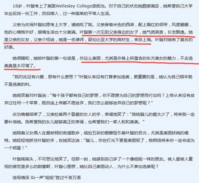 叶璇的继母只比她大 10 岁,毕业于哥伦比亚大学,学识出众。两人平日相处和睦,1999 年叶璇报名选美比赛,还是继母在一旁全力支持鼓励。